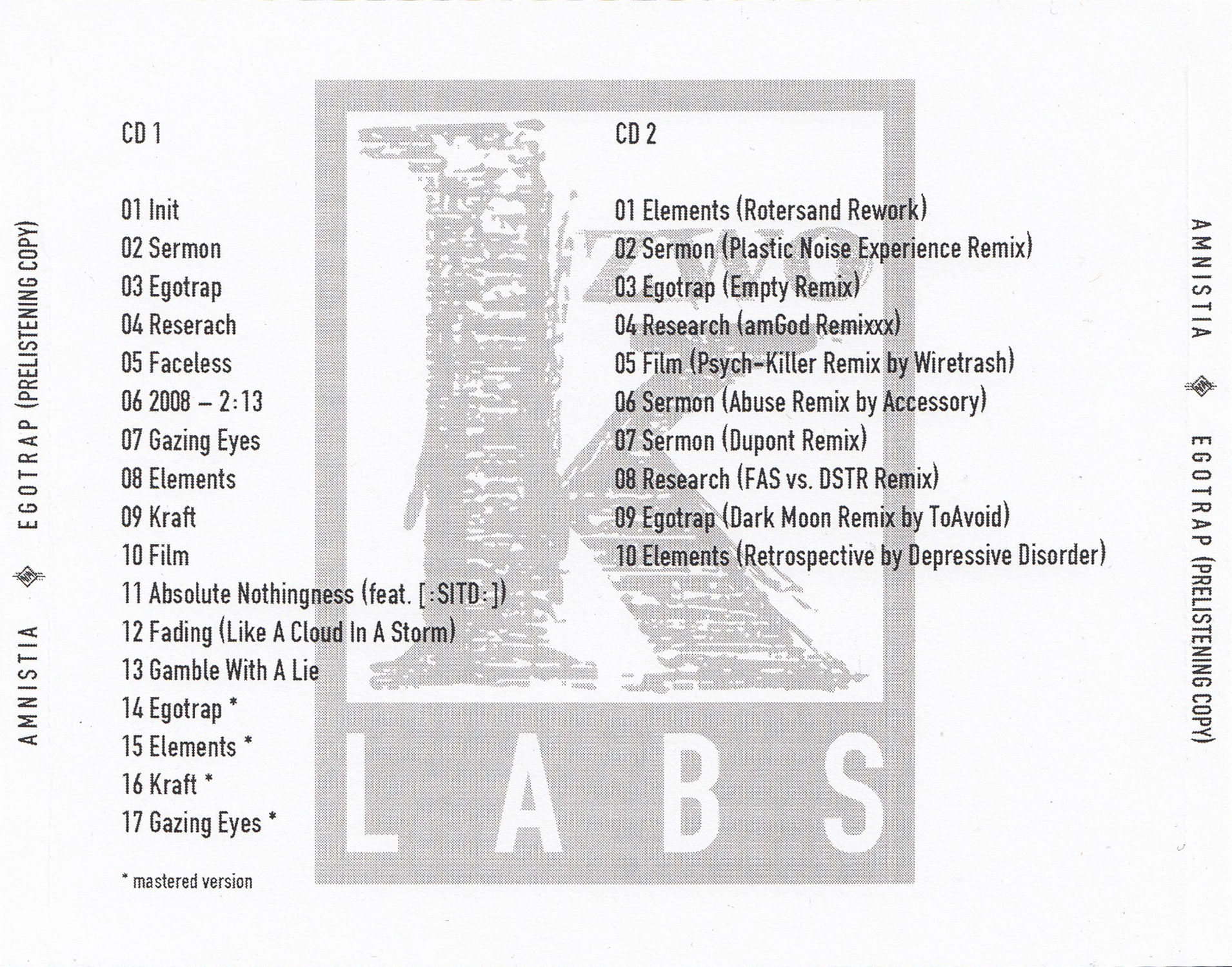 The Album was release in licence from Razgrom Music with three remeixes as Bonus Tracks. The Scanner release came as limited edition 2CD edition and later as CD without the bonus disc. The listeing copy had a different tracklisting with testmastered tracks and unreleased remixes.