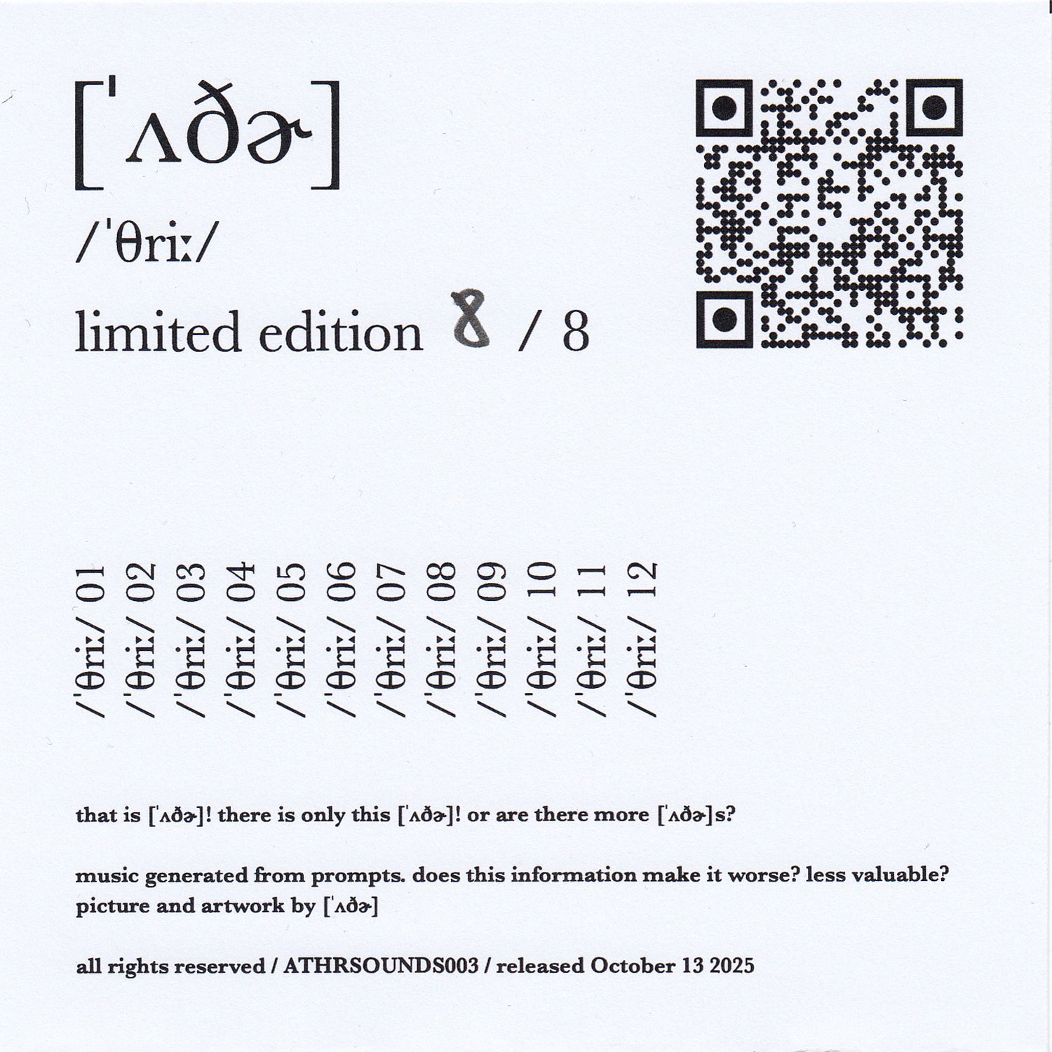 Tracks 01. /ˈθriː/ 01 6:10 02. /ˈθriː/ 02 6:01 03. /ˈθriː/ 03 6:23 04. /ˈθriː/ 04 5:23 05. /ˈθriː/ 05 5:20 06. /ˈθriː/ 06 5:27 07. /ˈθriː/ 07 6:46 08. /ˈθriː/ 08 6:48 09. /ˈθriː/ 09 6:55 10. /ˈθriː/ 10 4:48 11. /ˈθriː/ 11 7:22 12. /ˈθriː/ 12 7:52