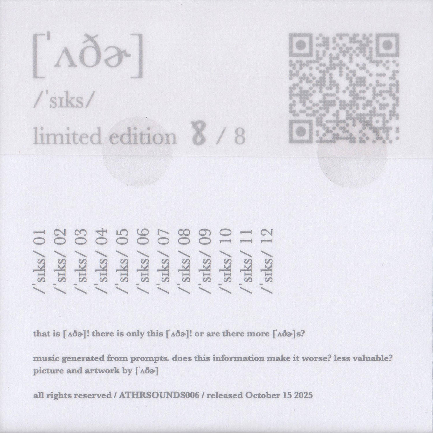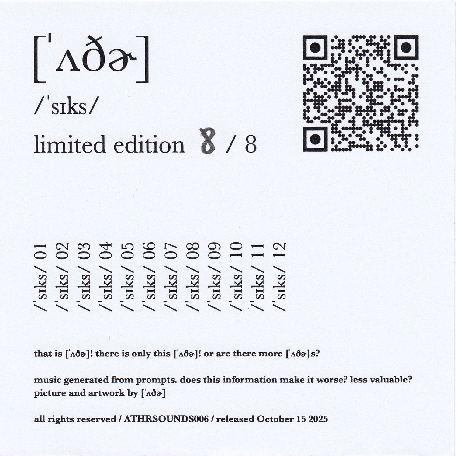 Tracks 01. /ˈsɪks/ 01 6:30 02. /ˈsɪks/ 02 4:57 03. /ˈsɪks/ 03 5:04 04. /ˈsɪks/ 04 6:38 05. /ˈsɪks/ 05 6:19 06. /ˈsɪks/ 06 8:08 07. /ˈsɪks/ 07 10:30 08. /ˈsɪks/ 08 6:06 09. /ˈsɪks/ 09 5:56 10. /ˈsɪks/ 10 5:51 11. /ˈsɪks/ 11 4:53 12. /ˈsɪks/ 12 6:30