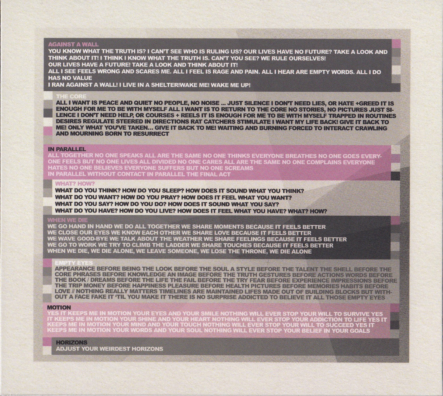 Tracks 01. / A1 Calls 0:00 02. / A2 Antithese 0:00 03. / A3 Lack Of Proof 0:00 04. / A4 A View 0:00 05. / B1 Graves 0:00 06. / B2 La Hora El Ganador 0:00 07. / B3 Glowing In The Dark 0:00 08. / B4 Dulcimer 0:00
