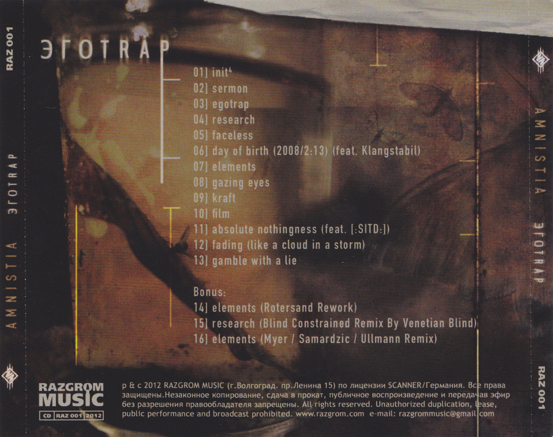 The Album was release in licence from Razgrom Music with three remeixes as Bonus Tracks. The Scanner release came as limited edition 2CD edition and later as CD without the bonus disc. The listeing copy had a different tracklisting with testmastered tracks and unreleased remixes.