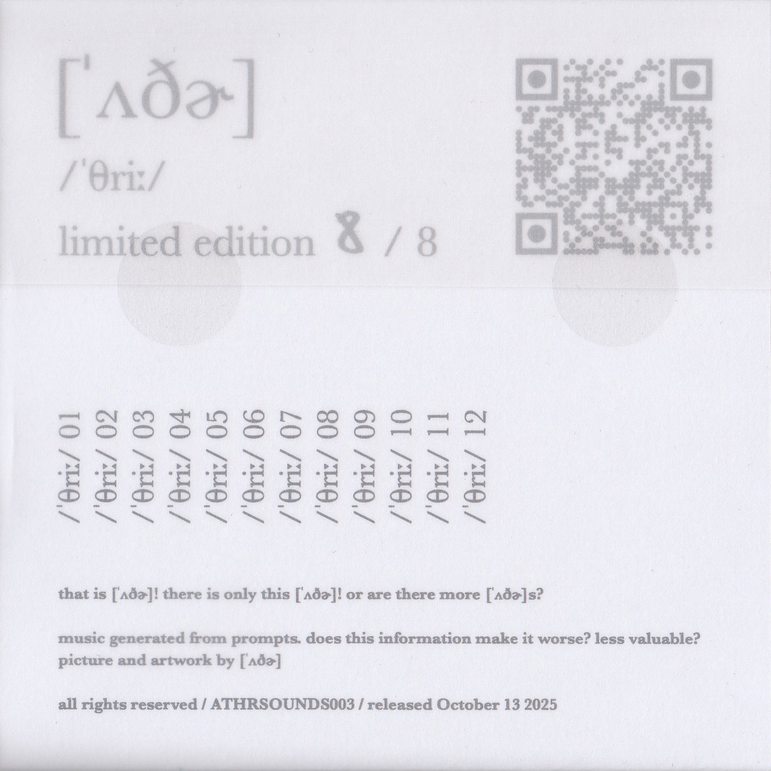 Tracks 01. /ˈθriː/ 01 6:10 02. /ˈθriː/ 02 6:01 03. /ˈθriː/ 03 6:23 04. /ˈθriː/ 04 5:23 05. /ˈθriː/ 05 5:20 06. /ˈθriː/ 06 5:27 07. /ˈθriː/ 07 6:46 08. /ˈθriː/ 08 6:48 09. /ˈθriː/ 09 6:55 10. /ˈθriː/ 10 4:48 11. /ˈθriː/ 11 7:22 12. /ˈθriː/ 12 7:52